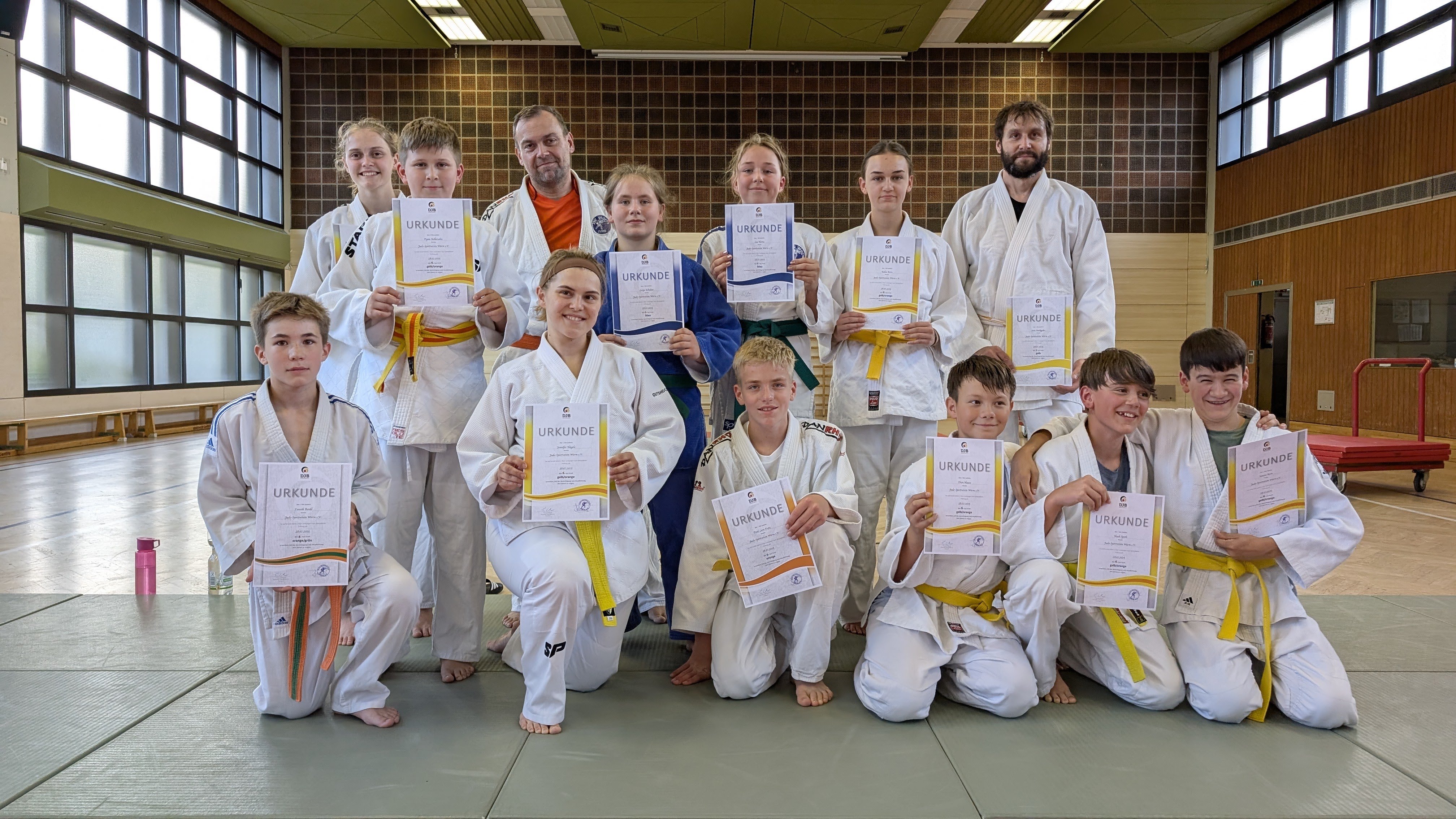 Eine solide Leistung zeigen unsere jüngeren Judoka, ohne größere Schwächen präsentierten sie ihr Prüfungsprogramm und durften nach bestandener Prüfung stolz ihr Urkunden für den nächsthöheren Gürtel unter Applaus der anderen Judoka und Eltern in Empfang nehmen. Ein schöner Saisonabschluss für unseren Nachwuchs.